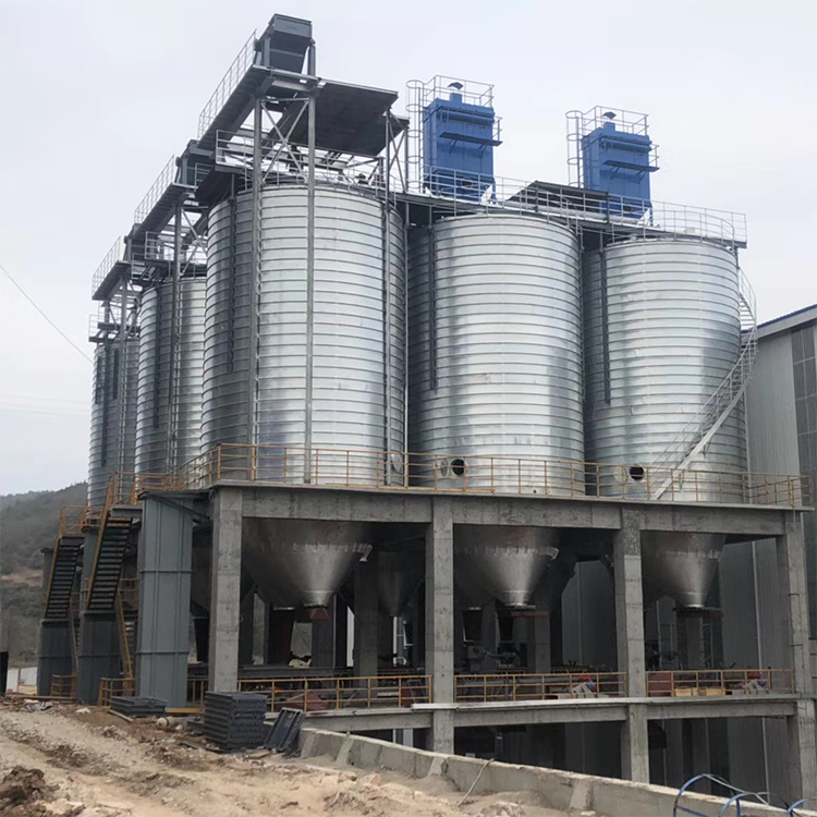 接收与清理设置在筒仓中央该形式筒仓一般采用对称排列,提升机井架固定,经过提升后的物料通过仓顶溜管进人筒仓。这种形式省去了仓顶输送设备和上通廊,从而节省了建造费用,缩短了建造工期。对于贮存时间要求较长的大型粮库,则应根据物料的流向、场地情况、工艺要求等合理地配置投料口、工作塔、烘干塔及安康钢板仓的位置。国华钢板仓介绍了这几种常见的进料形式,实际中可将各种形式相互组合,相互渗透,根据实际情况合理搭配,灵活选用。